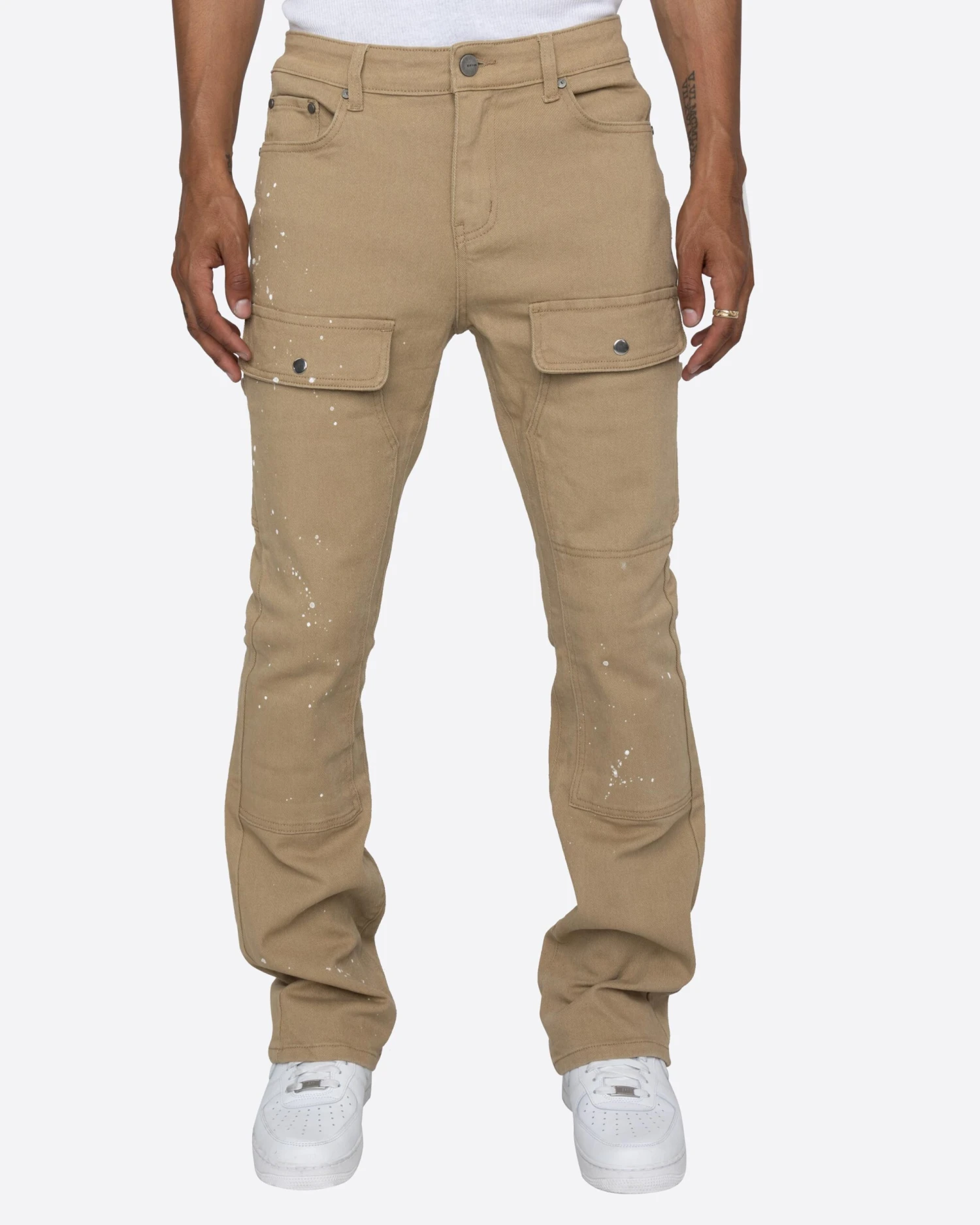 Handy flap pockets with easy snap closures for room to store your valuables. stone wash paint splatter design allover.