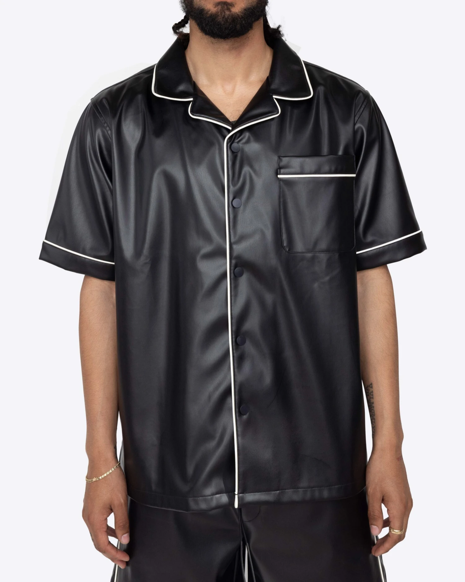 The Downtown Shirt is made with a vegan leather featuring piping details throughout. Pair it with the Downtown Shorts or Track Pants for your next festival fit.