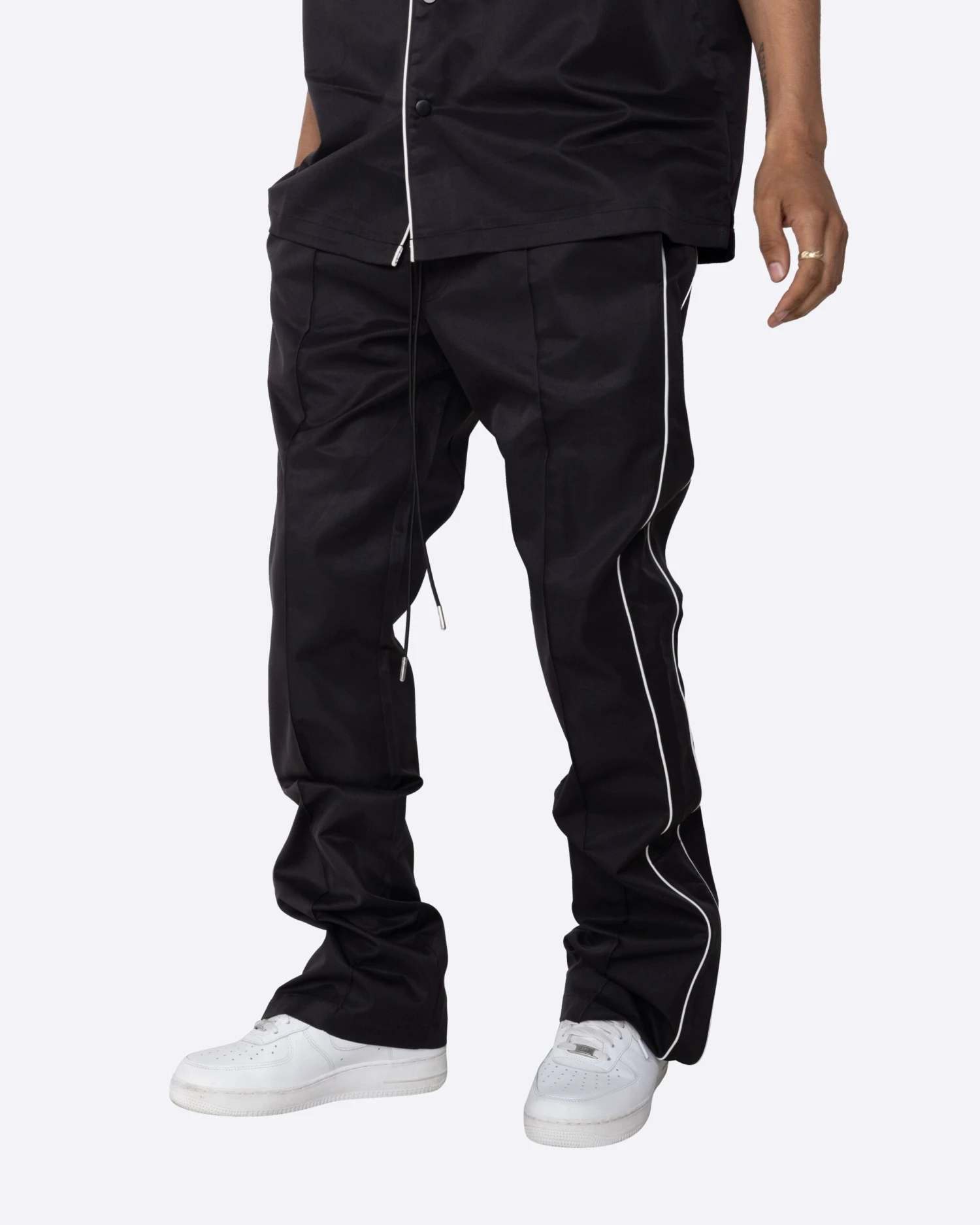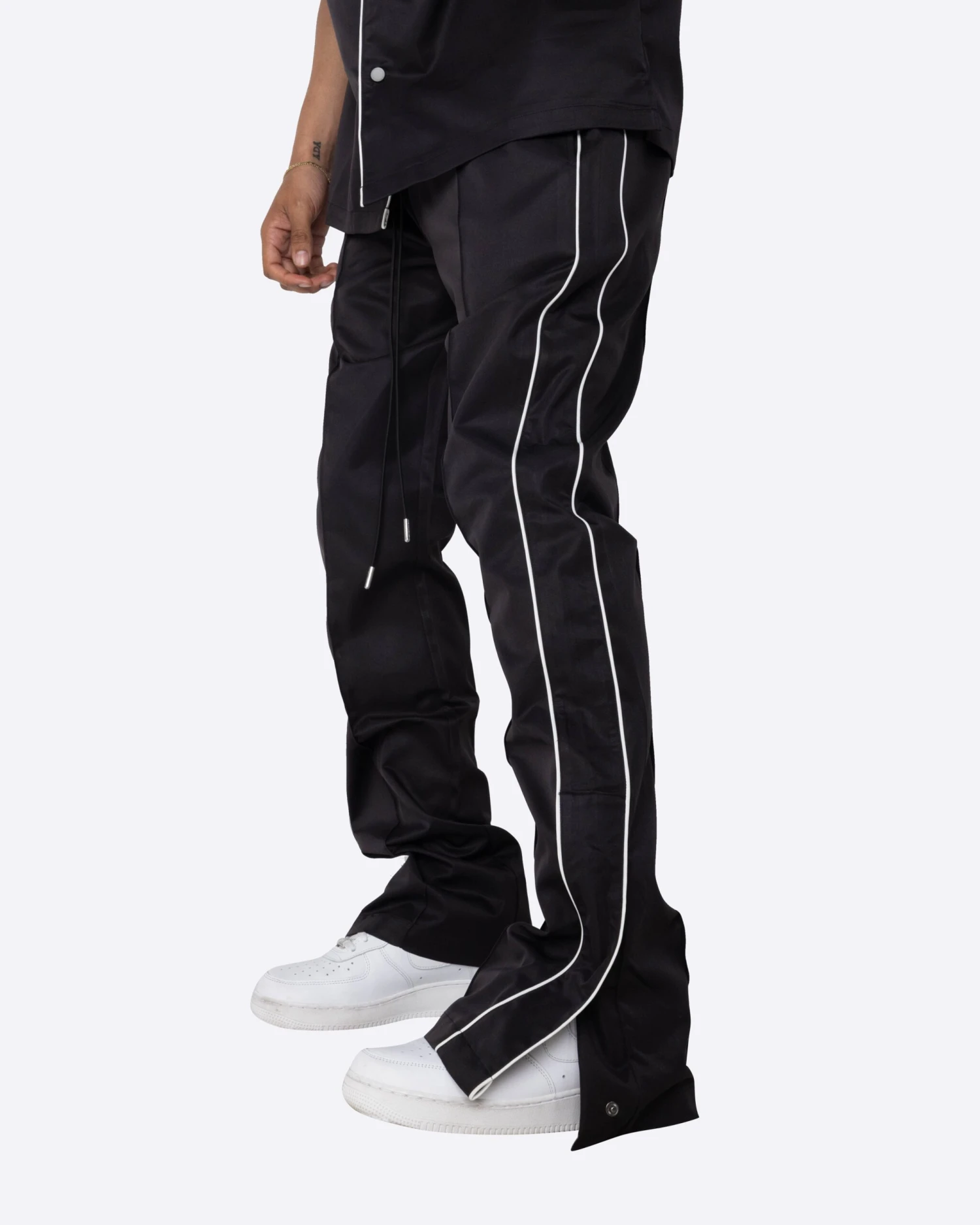 The Downtown Track Pants are the heat you need this summer. These flare pants are made with a sleek nylon, featuring contrast piping and a side snap button opening at the hem.