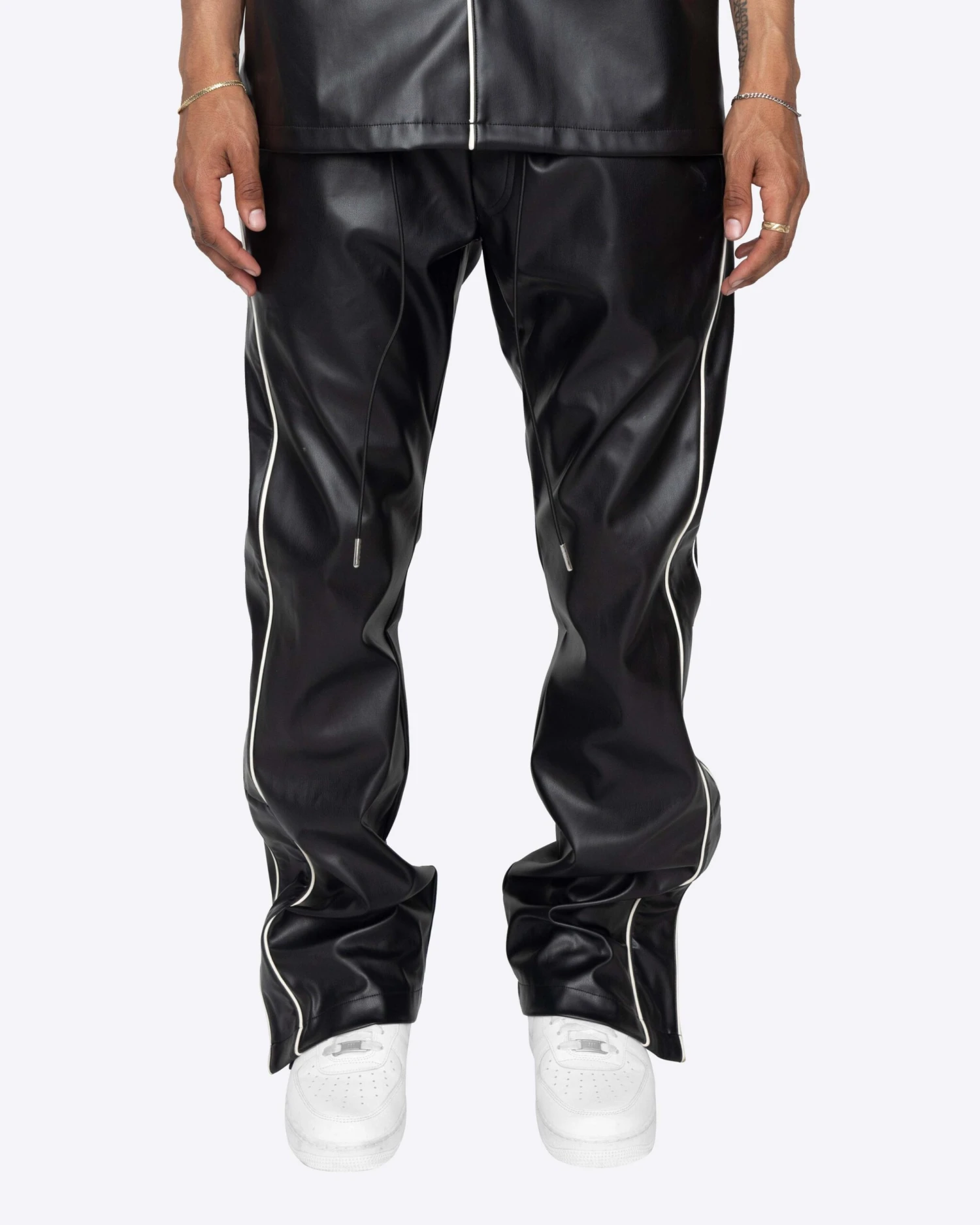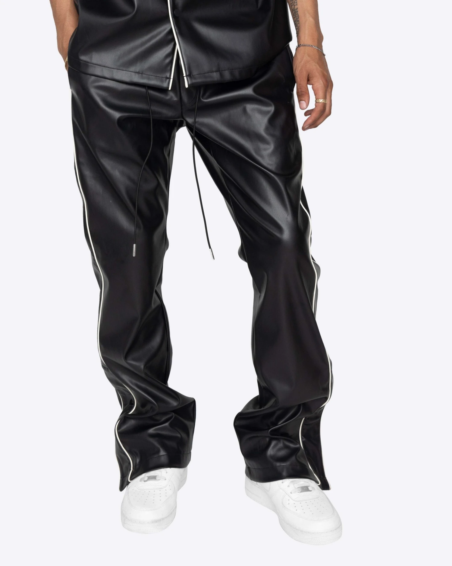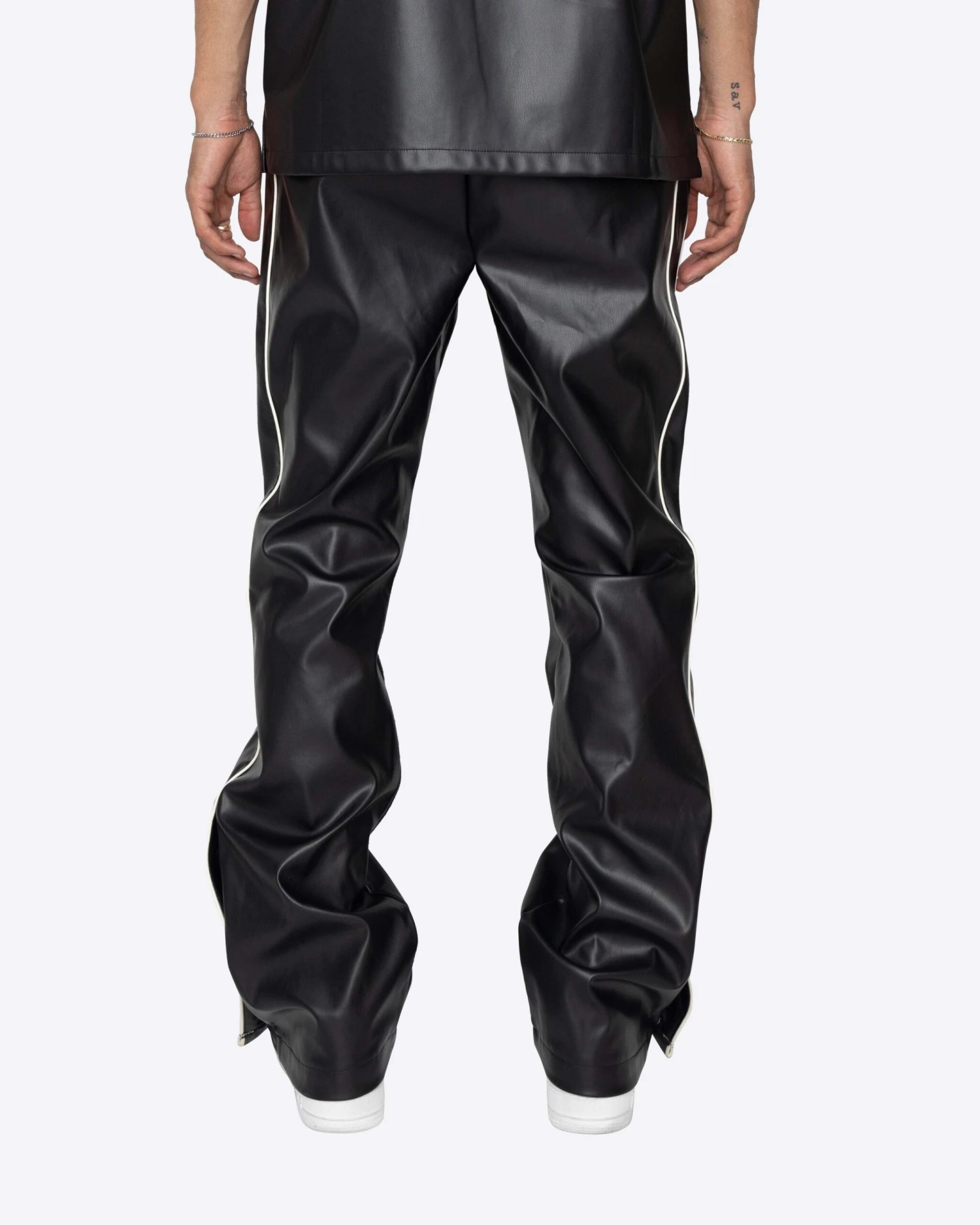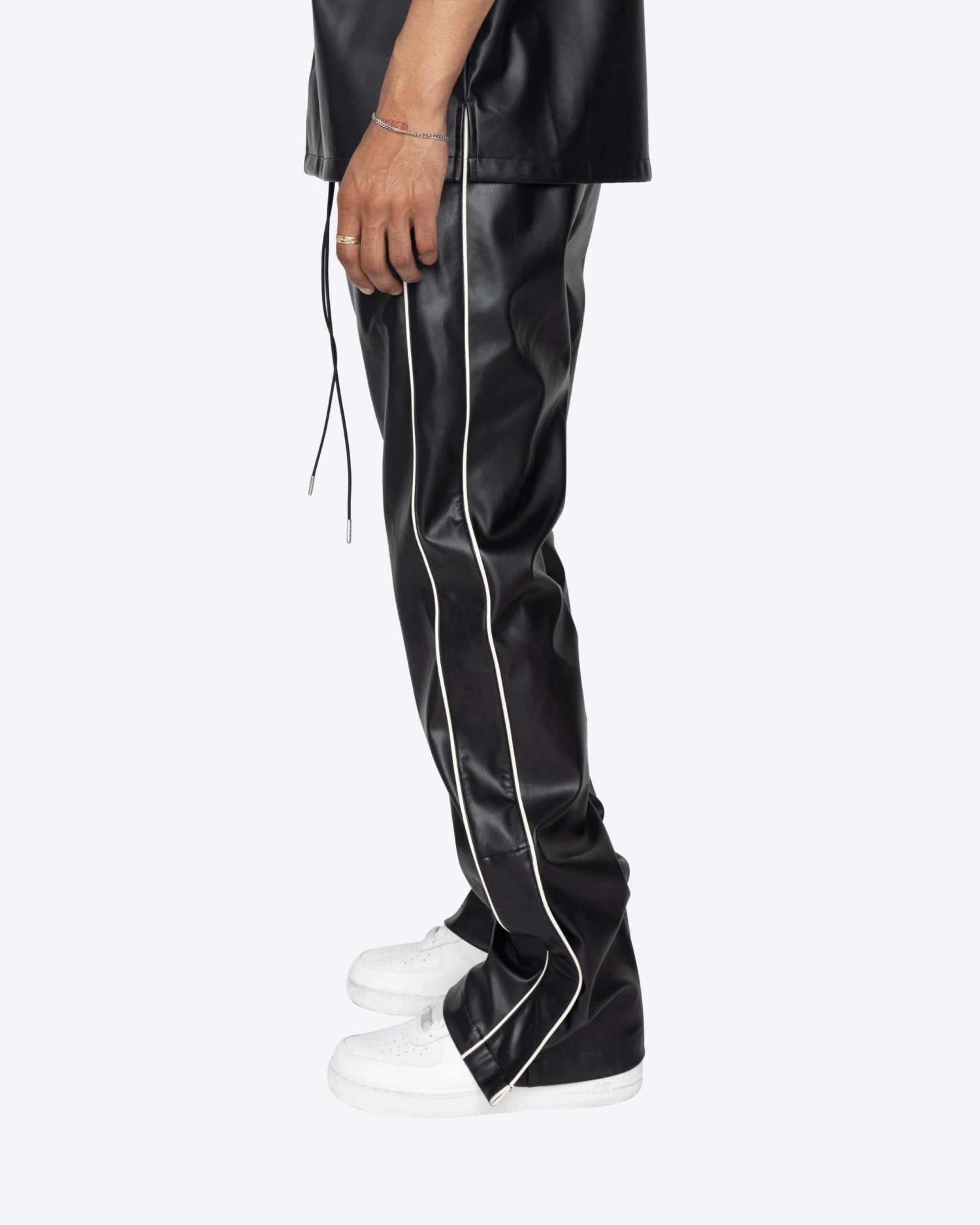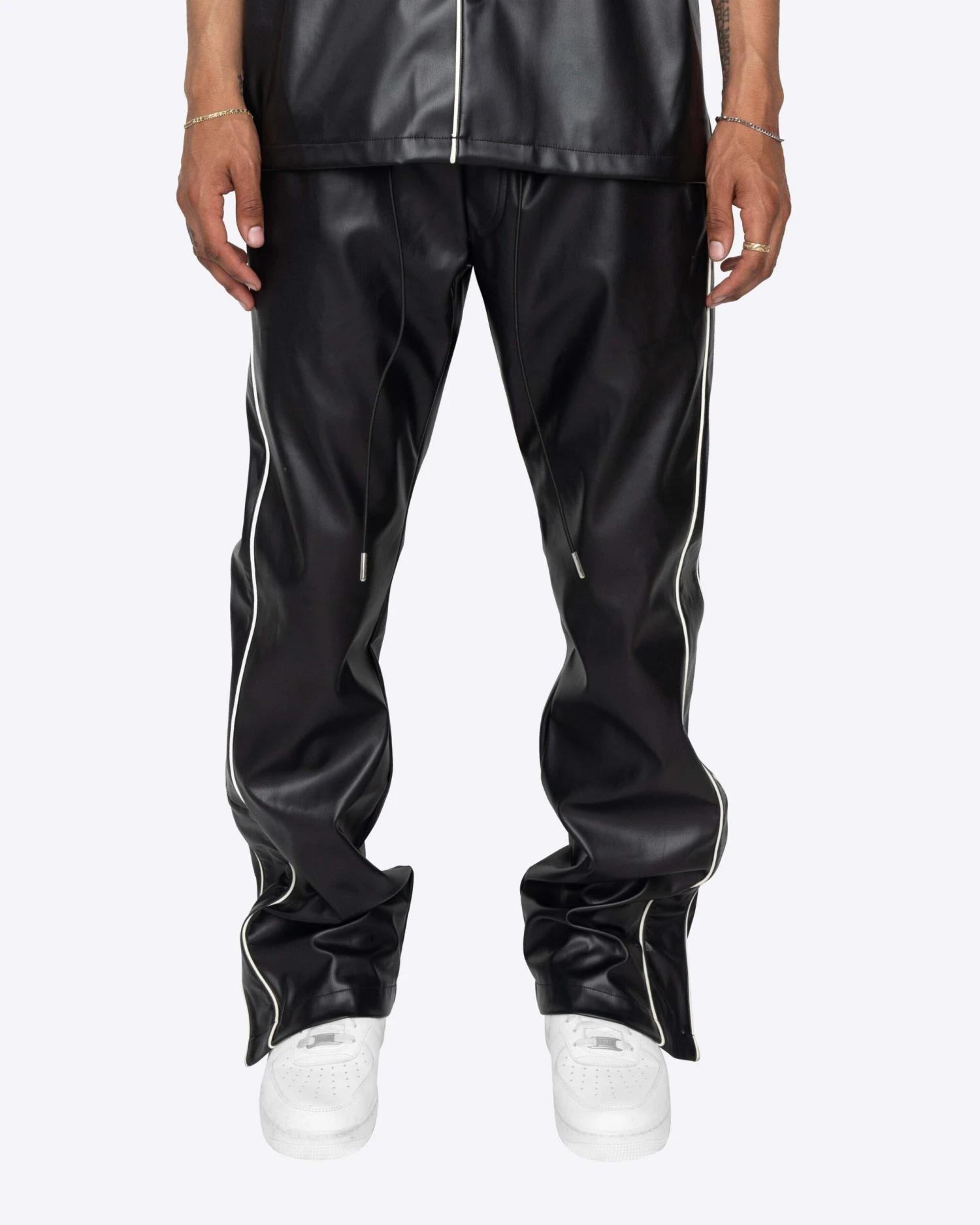 The Downtown Track Pants are the heat you need this summer. These flare pants are made with a vegan leather, featuring contrast piping and a side snap button opening at the hem.