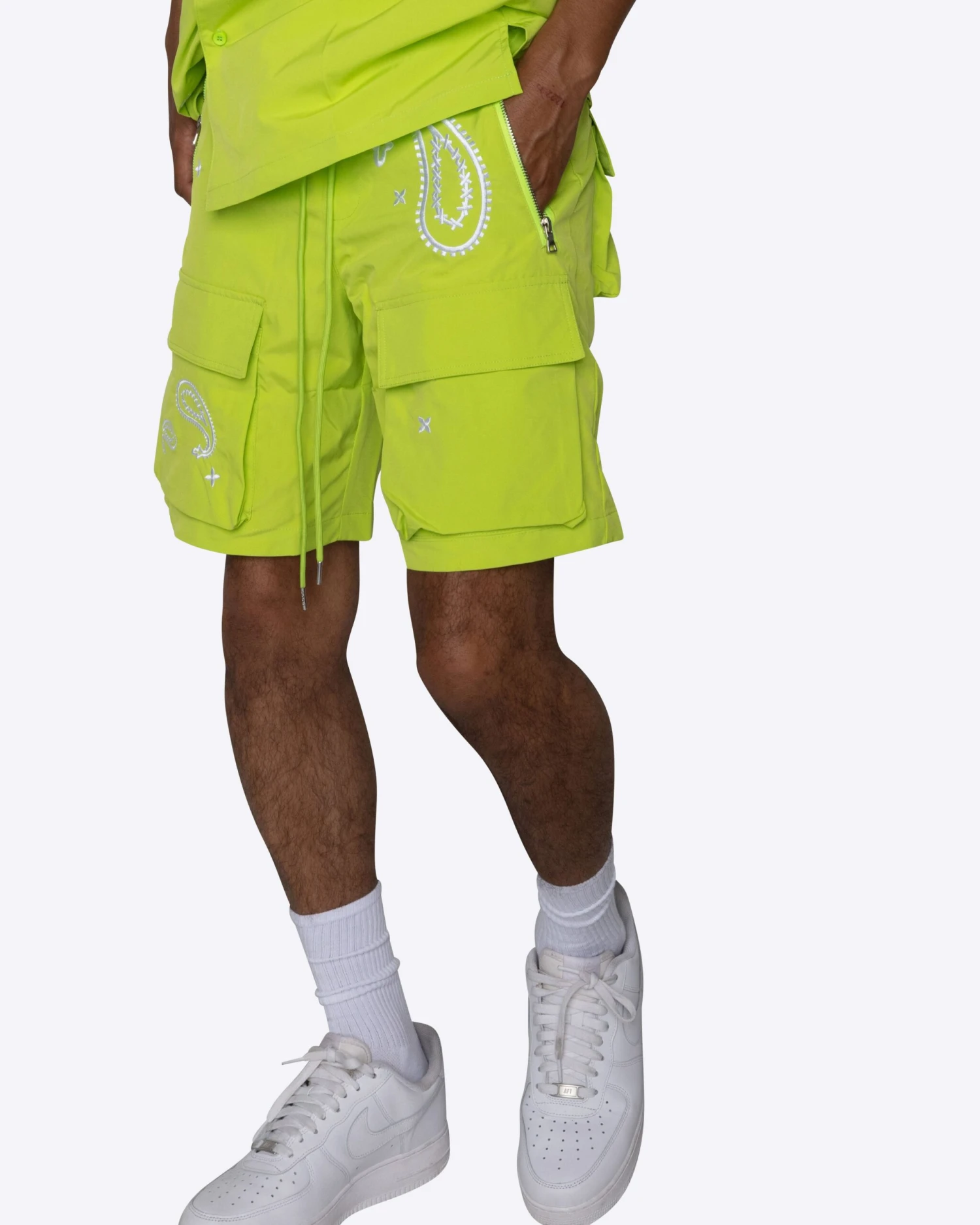 Match the Easton Shorts with the Easton Shirt and it’s a vibe. These shorts feature cargo pockets and embroidered paisley details.