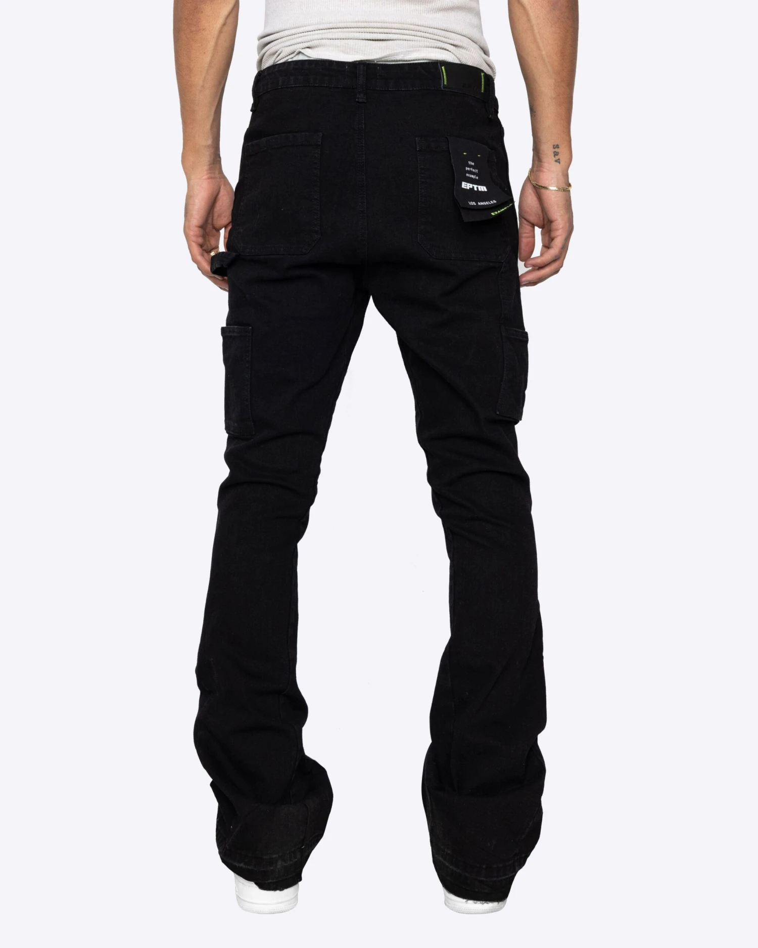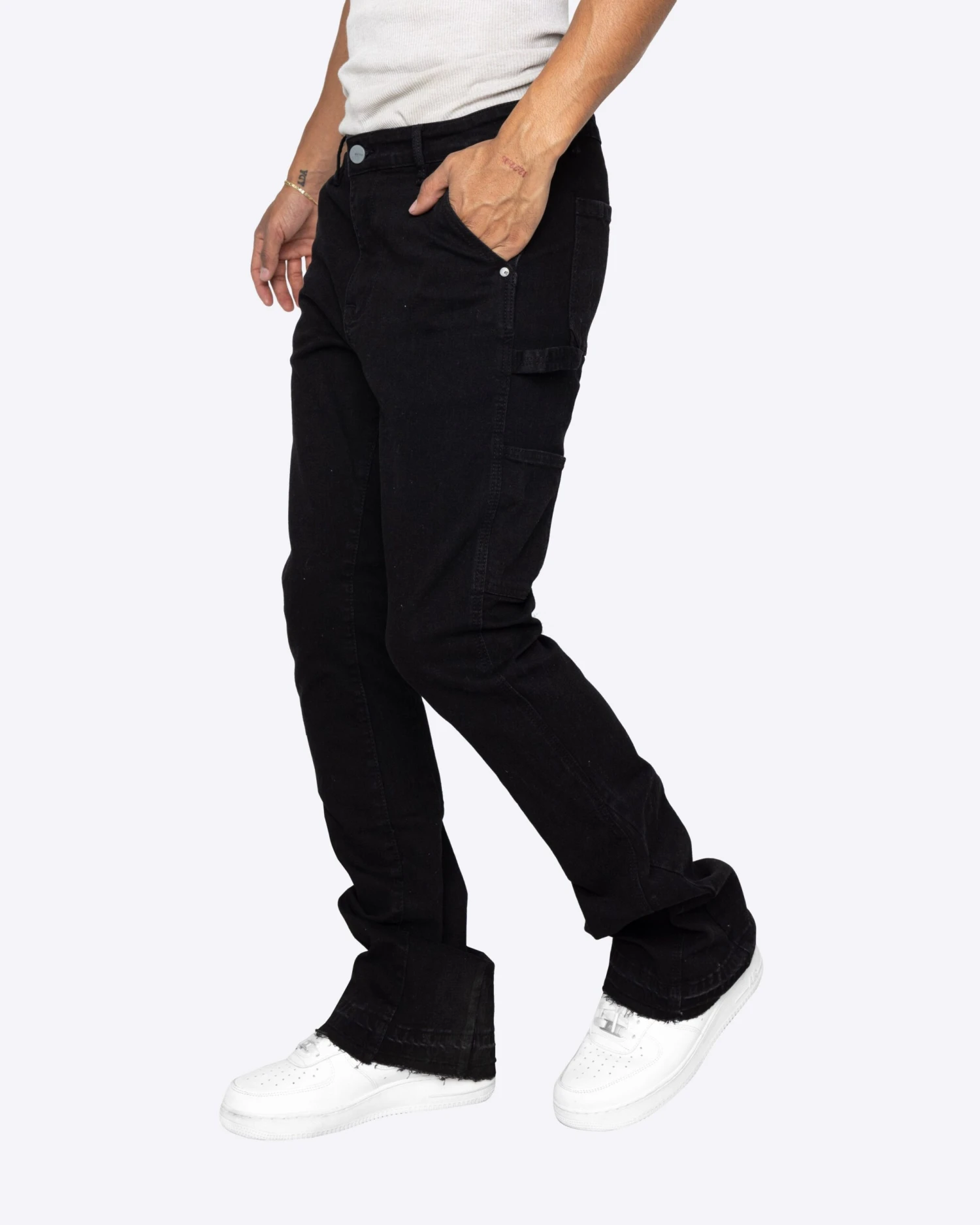The nine flare pants is carpenter detail, paneling at the inseam and side seam for a flare, washed, and finished with a released hem.