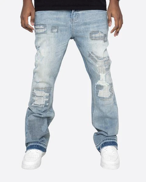 The Outlook Flare Jeans features a slim flared leg and released raw edge hem. The distressing details through out are ripped and repaired.