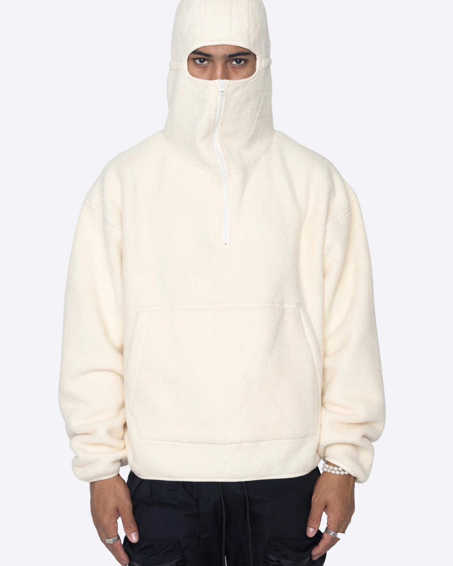 The Polar Hoodie is next level. It features a quarter zip front and a balaclava style hood. The fabric is bonded with a soft micro fleece interior and a sherpa fleece exterior.
