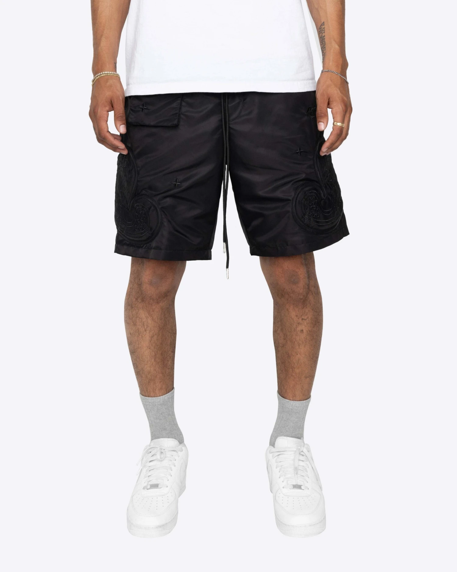 The Puffer Paisley Shorts feature puffer paisley patches and embroidered paisley details.