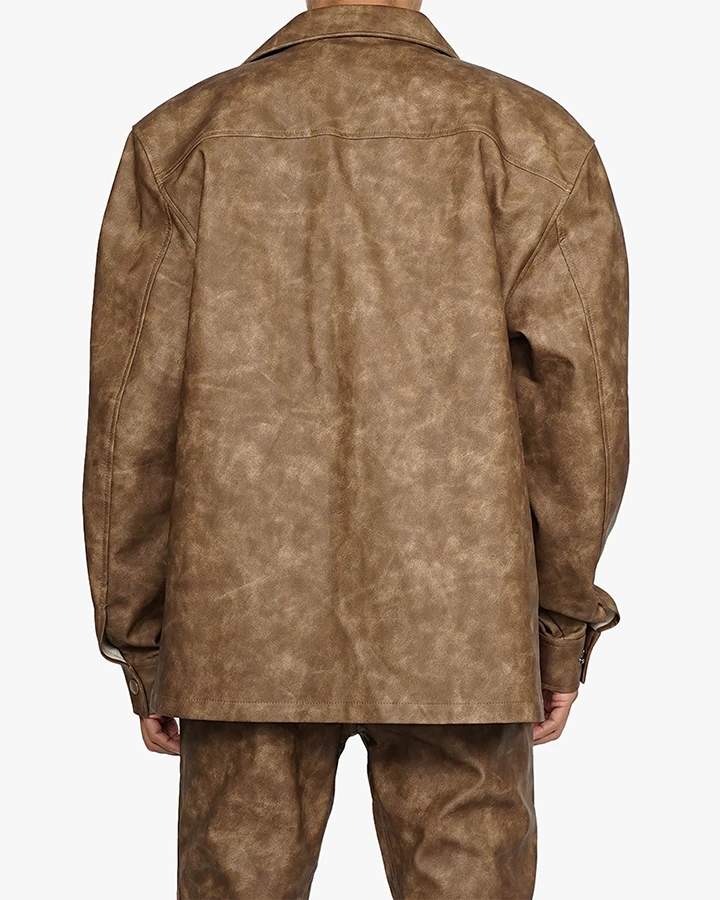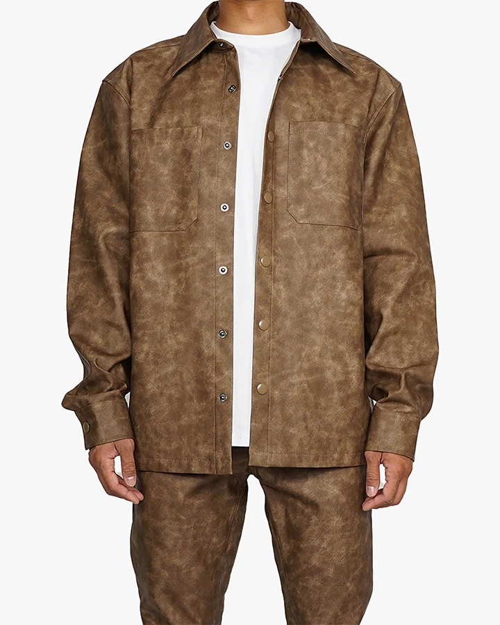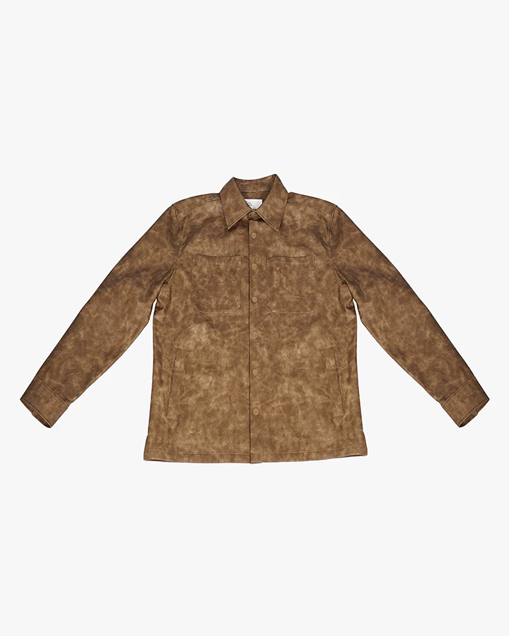The Roadhouse Shirt takes a classic silhouette and creates a new spin. Made with vegan leather with a distressed look, this shirt is perfect for a fresh fall fit.
