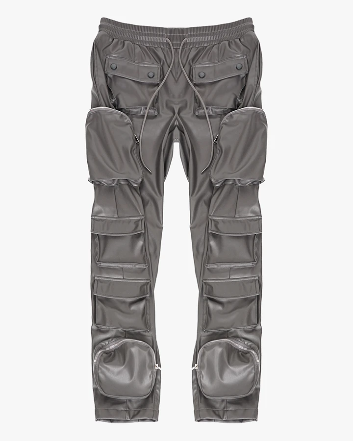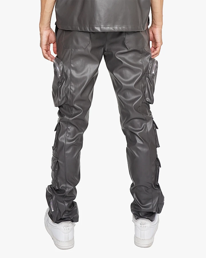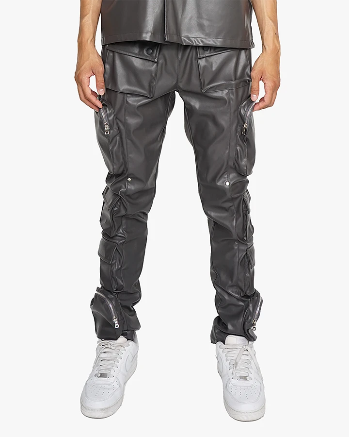 The Saint Cargo Pants boast a relaxed skinny fit and are crafted from vegan leather fabric, offering both style and sustainability. These pants also come equipped with multiple cargo pockets for added functionality.