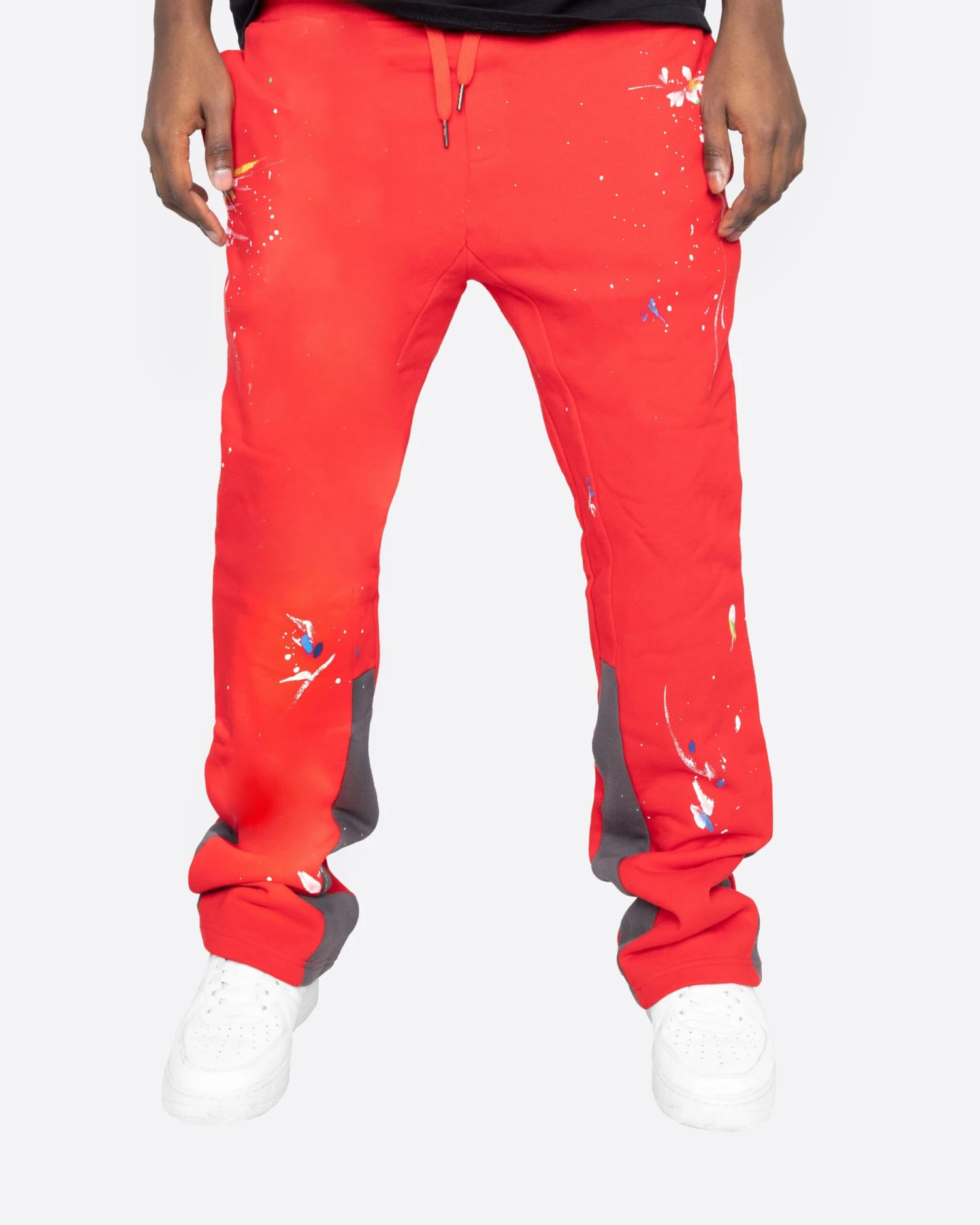 For The Showroom sweatpants. These Three-Tone French Terry Sweatpants feature a flared ankle with a contrast inseam panel. Inspired by vintage Jackson Pollock paintings, we went crazy with the paint brush – giving these a custom paint splatter unique to each pair. Made for the rebels and the artists.