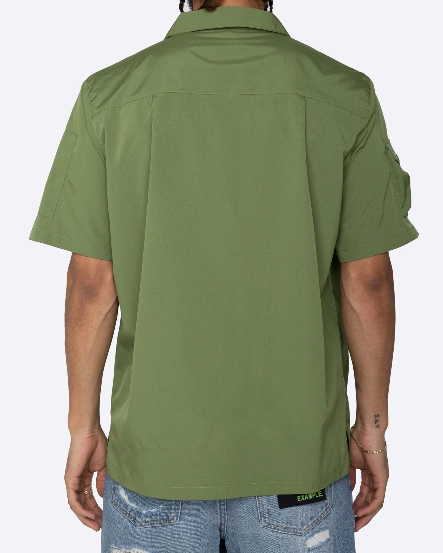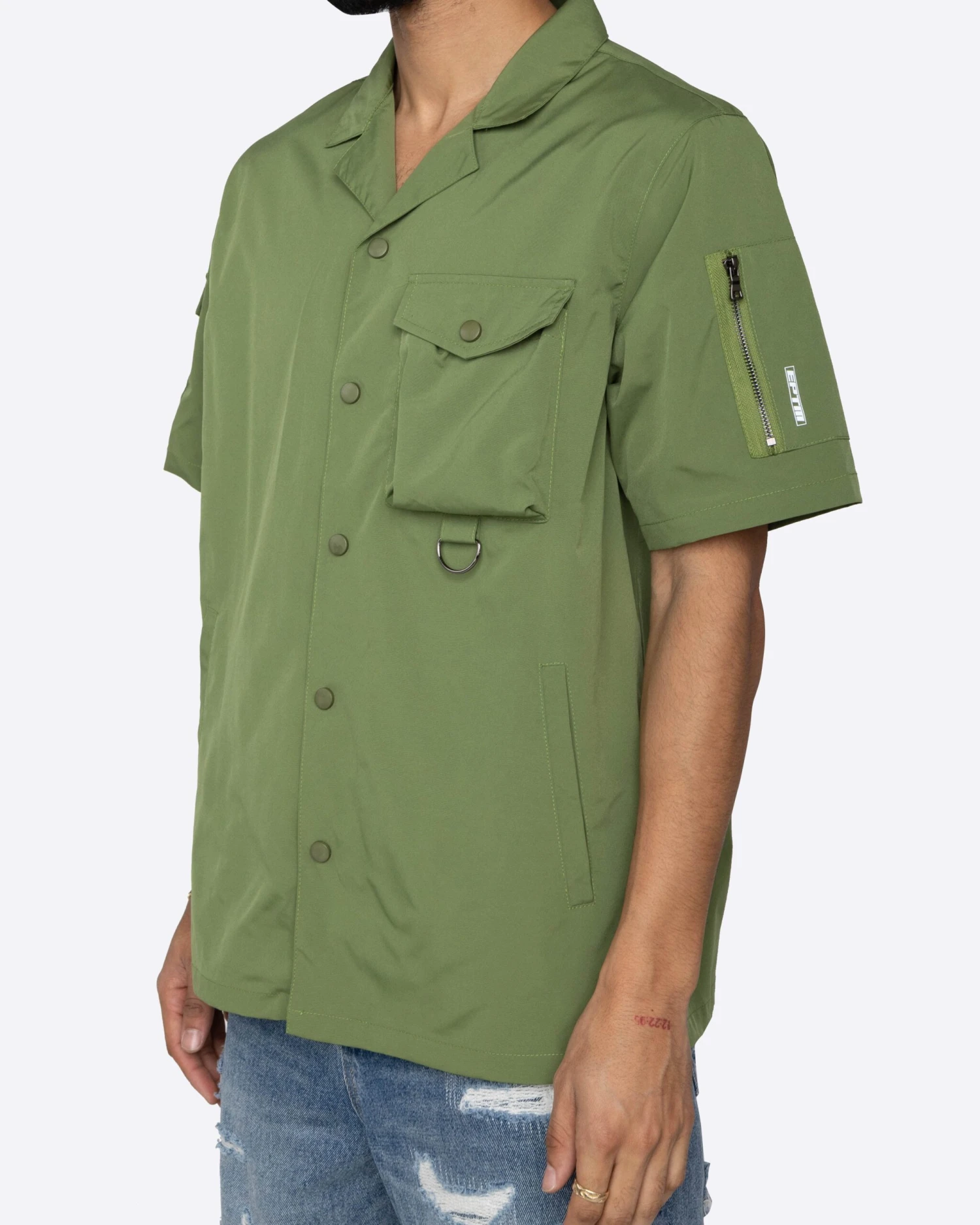 The Snap Button Shirt. This short sleeve shirt features a bowling shirt style collar, snap button front opening, and utilitarian style pockets reinvented in a contemporary way.
