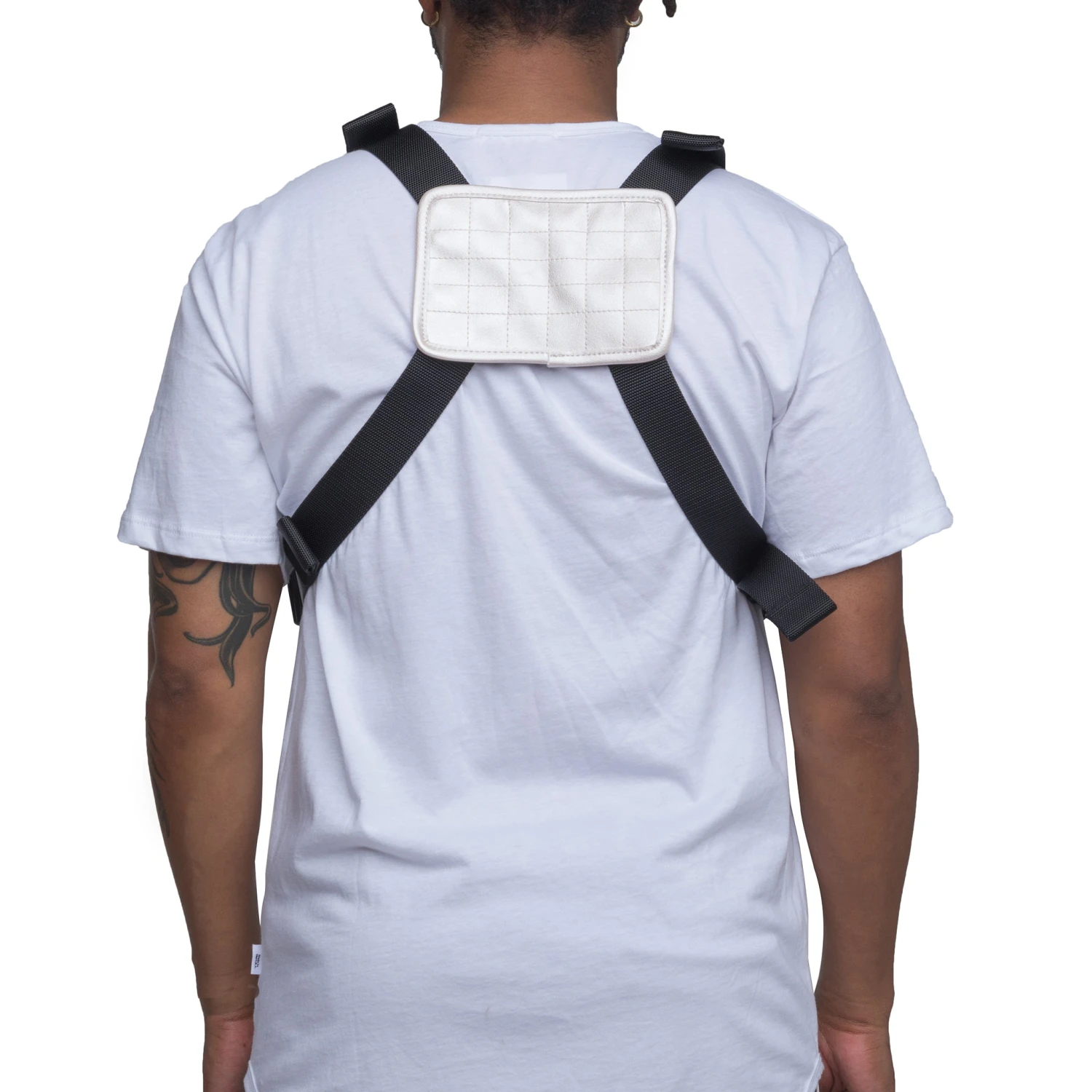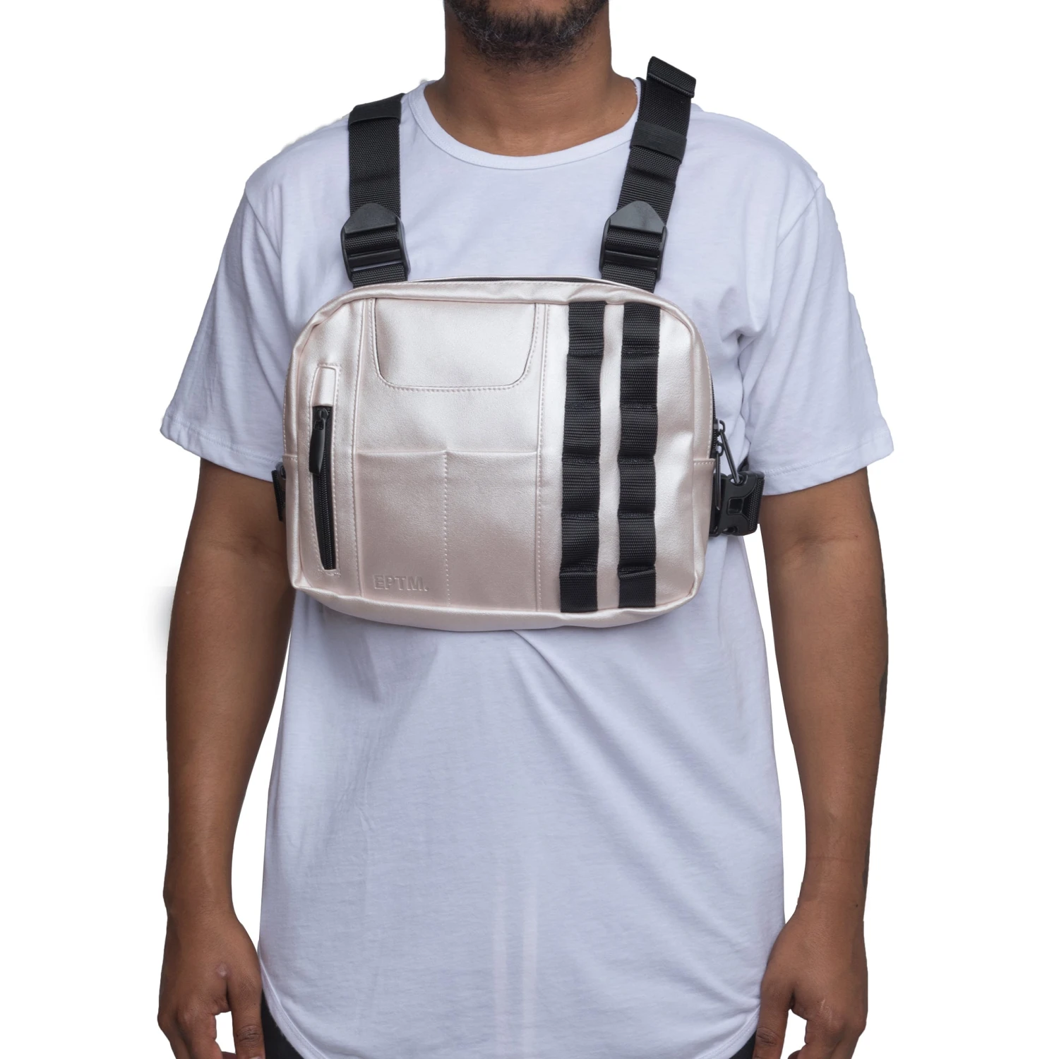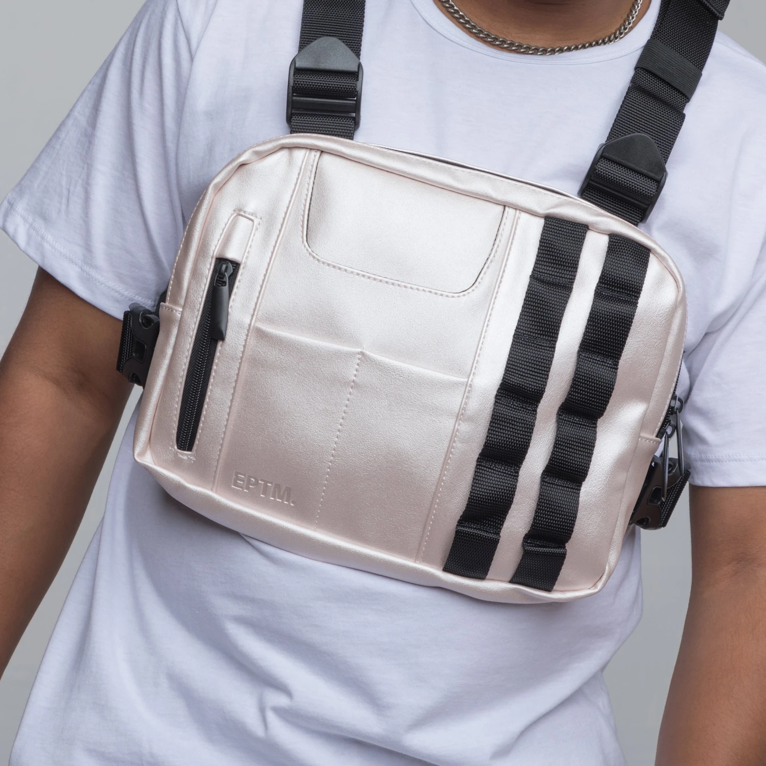 Vegan leather chest bag with adjustable webbed shoulder and back belt and buckle closure. Large zipper pocket opening across top. Front of bag features small zipper pocket, fashion details at the front