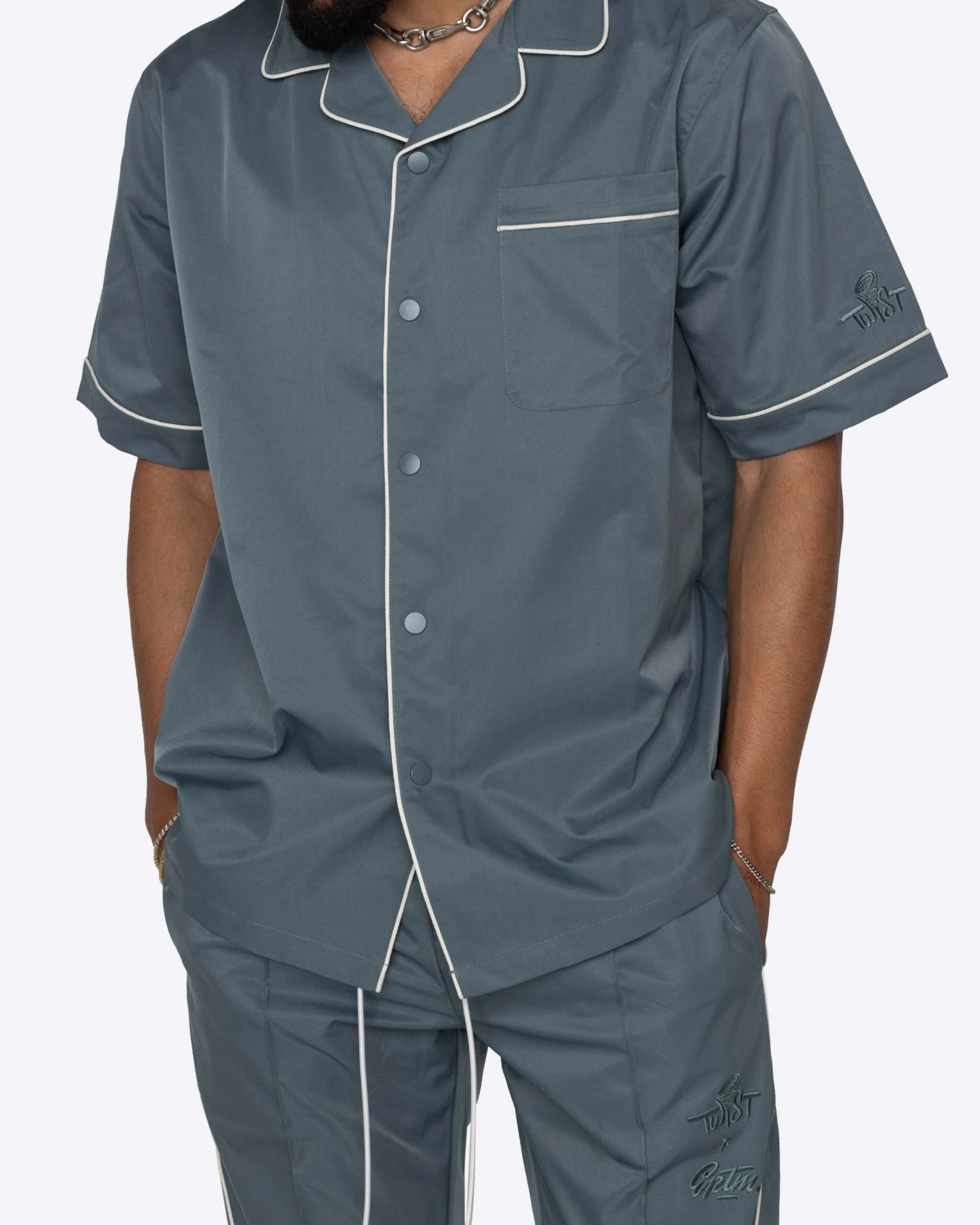 Lil Twist x EPTM. collaborate to bring back the Downtown Shirt in one color only! This shirt is made with a cotton-like nylon featuring piping details throughout. Pair it with the Downtown Shorts or Track Pants for your next festival fit.