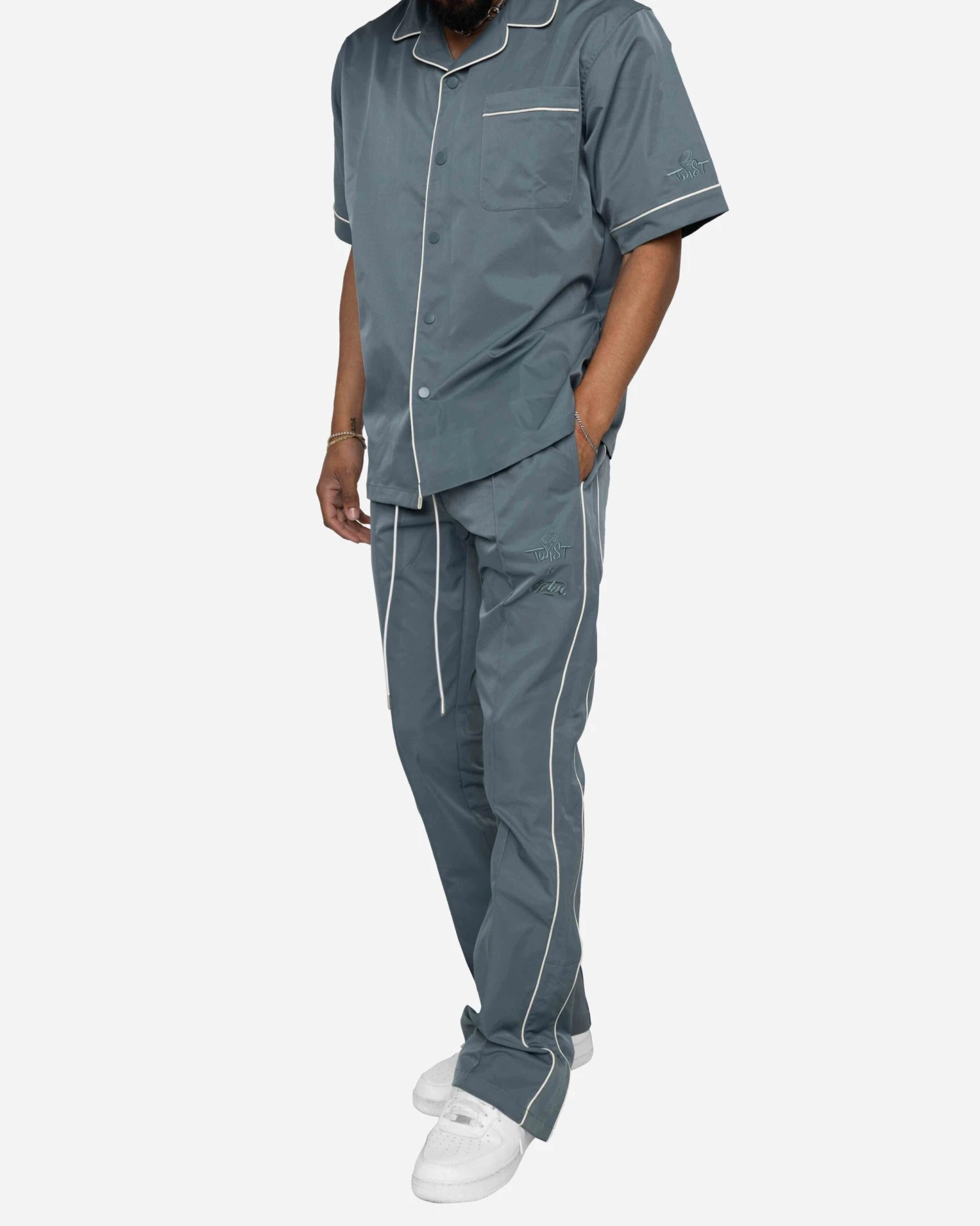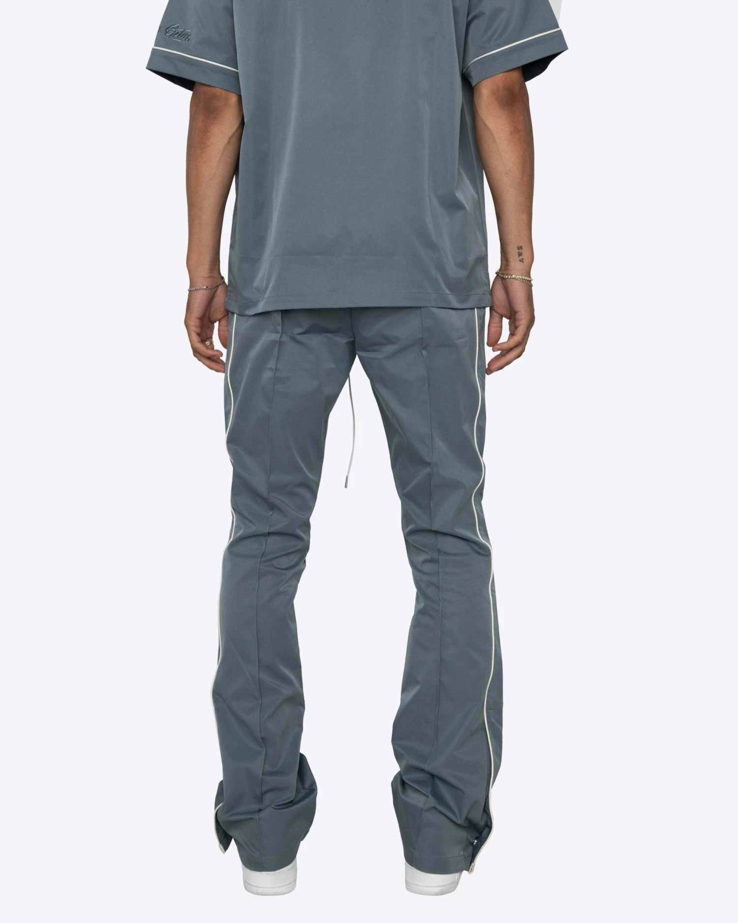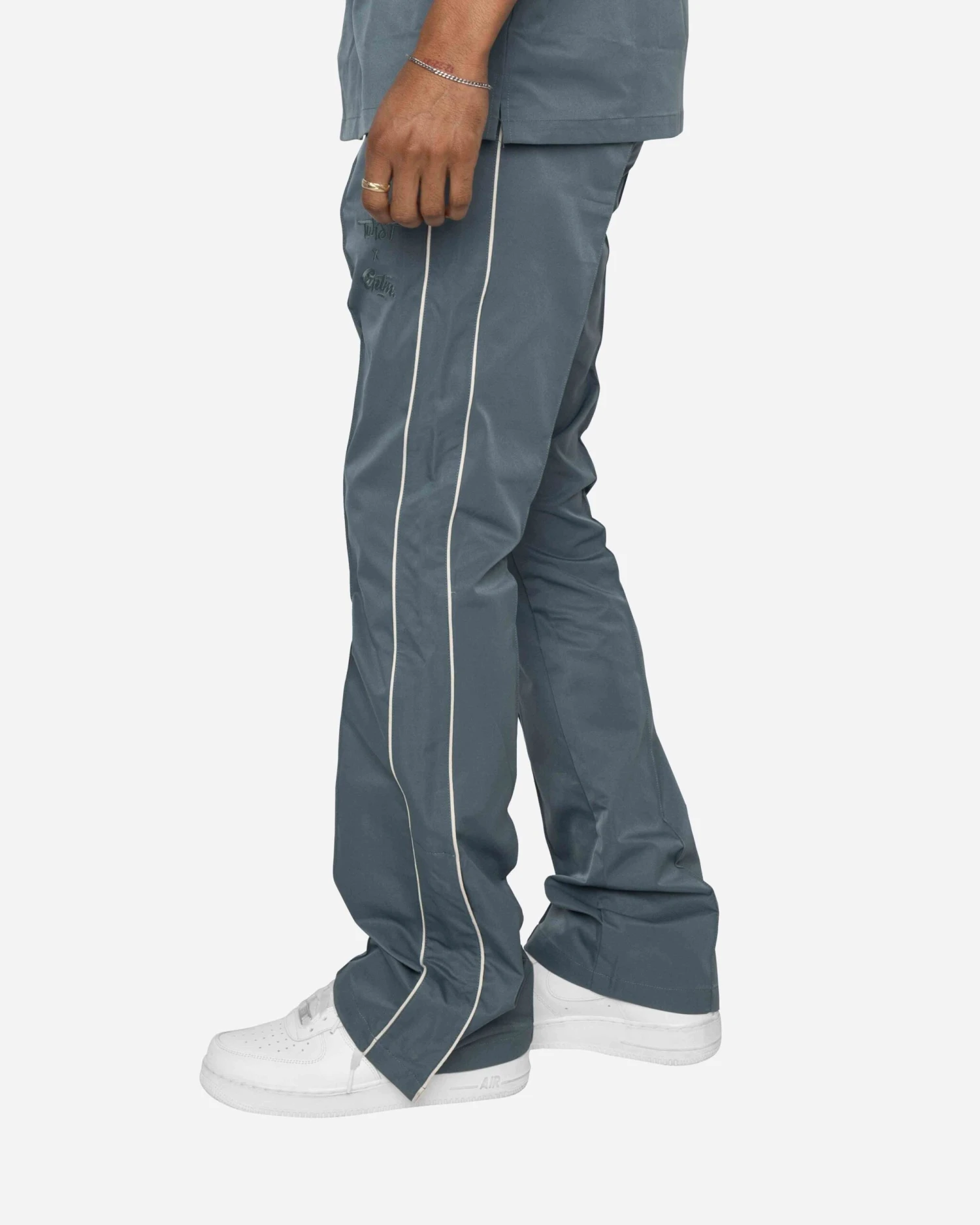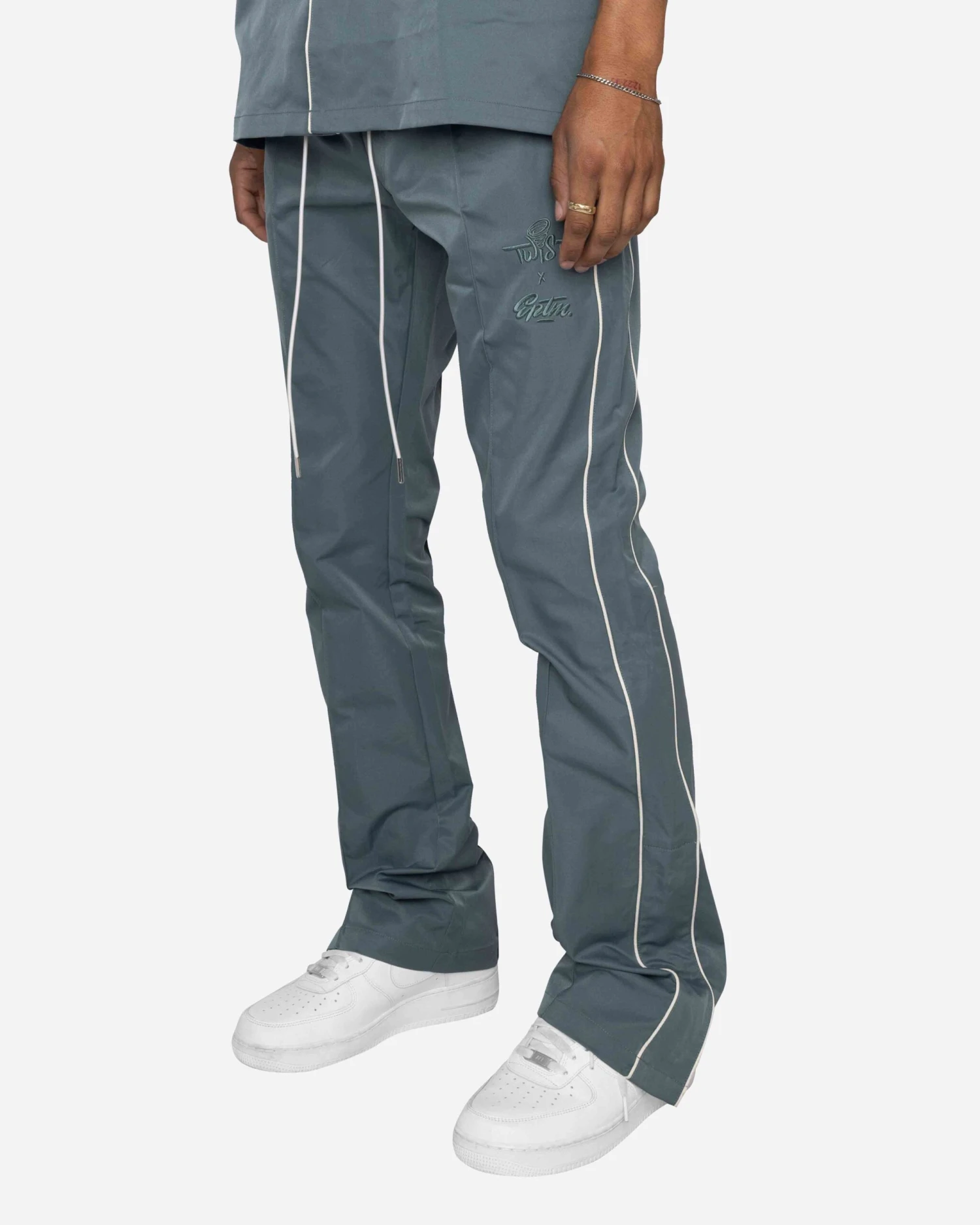 Lil Twist x EPTM. present the Downtown Track Pants in this exclusive color! These are the heat you need this summer. These flare pants are made with a sleek nylon, featuring contrast piping and a side snap button opening at the hem.